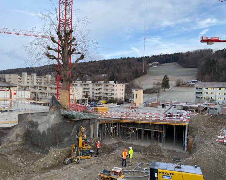 Eine besondere Herausforderung der Überbauung Dorfmitte Rüfenacht liefert die bestehende Linde auf dem Grundstück. Mit ihren gut 23 Metern Höhe und einem geschätzten Alter von 150 Jahren, soll sie geschützt und erhalten werden. Sämtliche Bauarbeiten werden so geplant und ausgeführt, dass der Bereich rund um den Baum ausgespart wird. Somit wird ein klares Zeichen für Nachhaltigkeit und Naturschutz gesetzt! Altes und Bestehendes wird mit Neuem vereint.